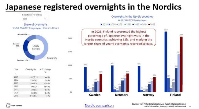 2025年、北欧諸国における日本人宿泊数のうち、フィンランドは52%と最も高い割合を占め、過去最大のシェアを記録しました。 |