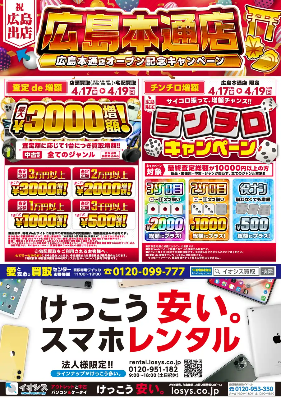 4月17日(金)のオープン当日を含む3日間限定で、広島本通店限定の大特価販売セールを開催いたします。iPhone 17や現行モデルのiPad mini、AQUOS sense9の未使用品など、イオシスの中でも屈指の人気商品を揃え、皆様のご来店をお待ちしております。 |