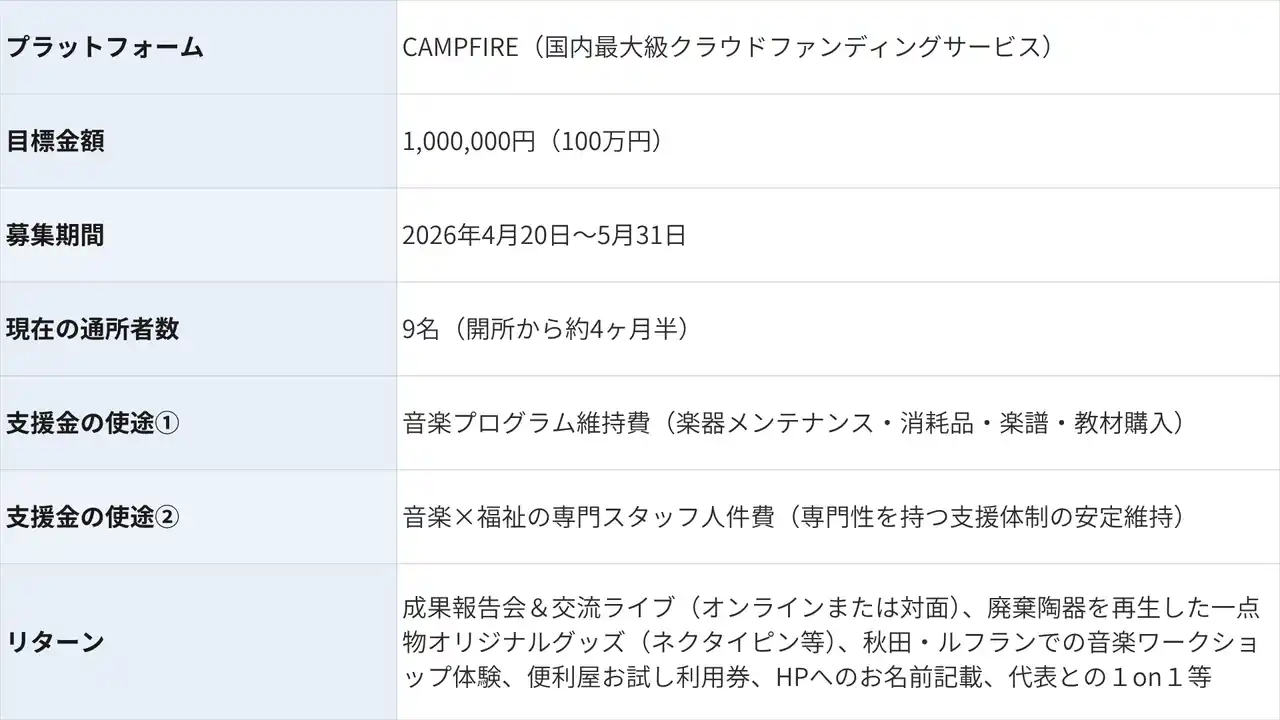 目標金額は100万円、募集期間は約30日間(2026年5月31日ごろ終了予定)。引きこもりや障がいを抱える方が、音楽・表現活動を通じて自分らしく働き、地域とつながれる場をつくることを目的としています。 |