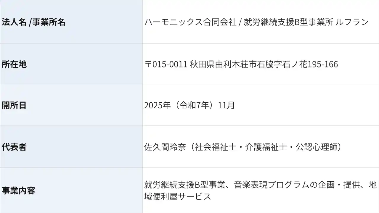 ハーモニックス合同会社(秋田県由利本荘市、代表:佐久間玲奈)は、2025年11月に開所した就労継続支援B型事業所「ルフラン」の運営継続・拡充を目的として、クラウドファンディングプラットフォーム「CAMPFIRE」にて資金募集を開始しました。 |