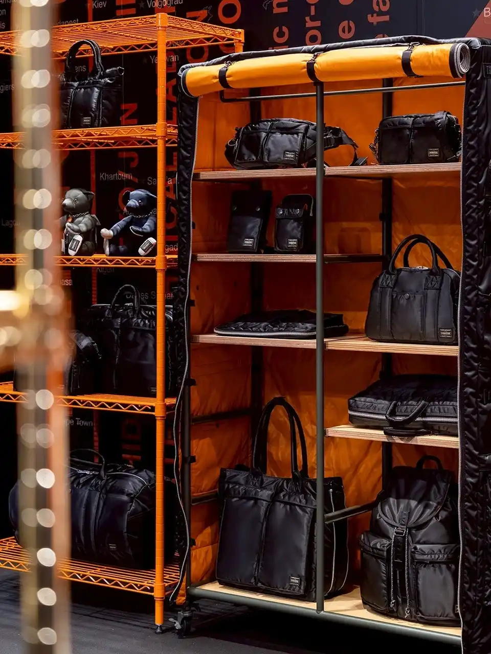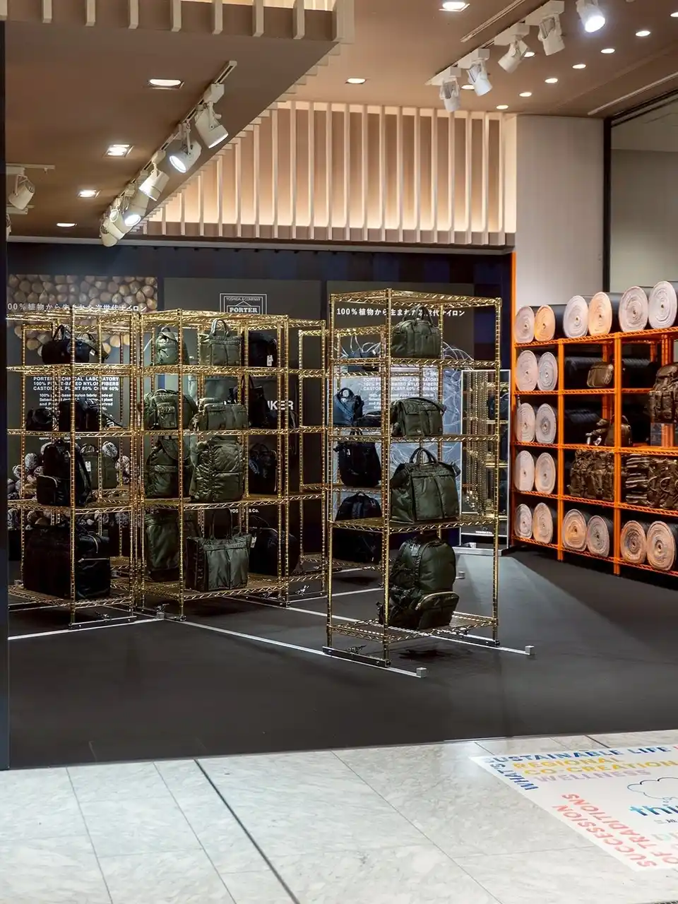 TANKER生地がバッグになる前のロールを並べた壁や、 |