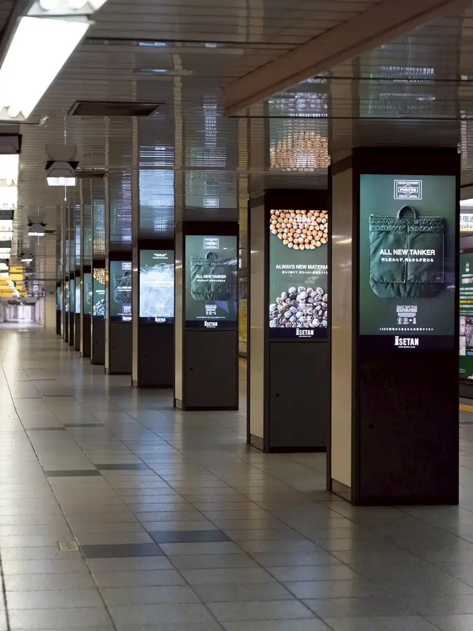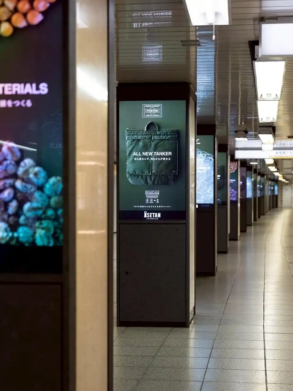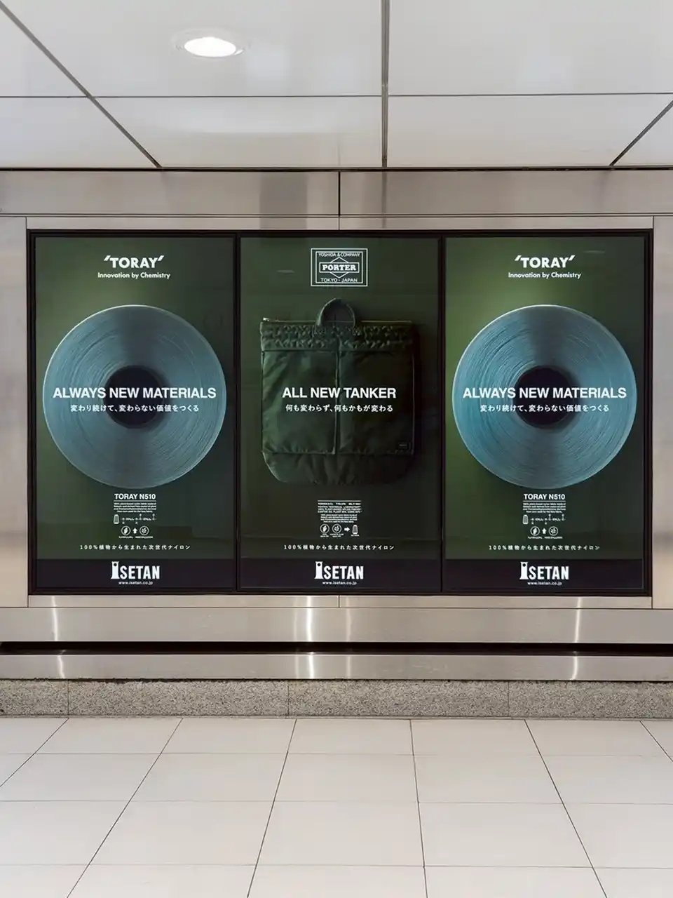 新宿三丁目駅や伊勢丹新宿店には、世界ではじめて量産化に成功した「100%植物から生まれた次世代ナイロン」の広告が掲出されています。 |