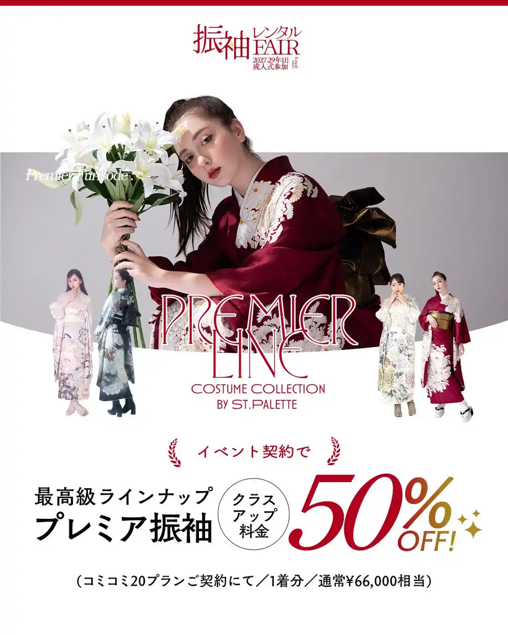本フェアでは、2027年1月、2028年1月の成人式参加予定者に向けて、人気振袖から最高級ライン「Premier Line」まで幅広くご紹介。 |