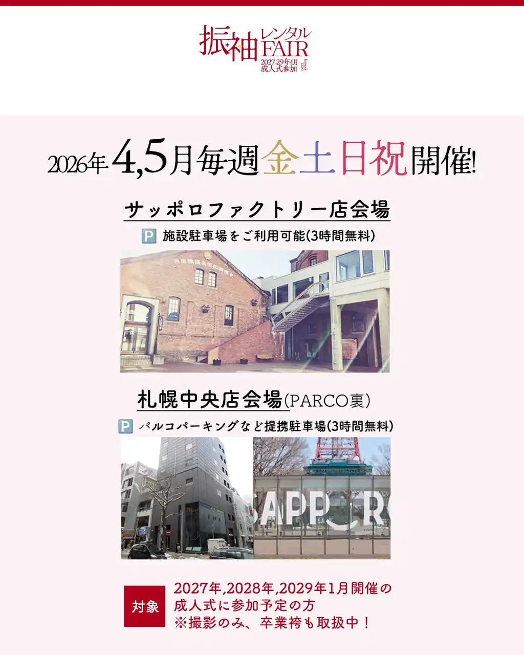 北海道を拠点にフォトスタジオ・振袖レンタルサービスを展開する写真工房ぱれっとは、2026年4月、5月毎週金土日祝にて、札幌エリアの2会場「サッポロファクトリー店」「札幌中央店」にて、振袖レンタルフェアを開催いたします。 |