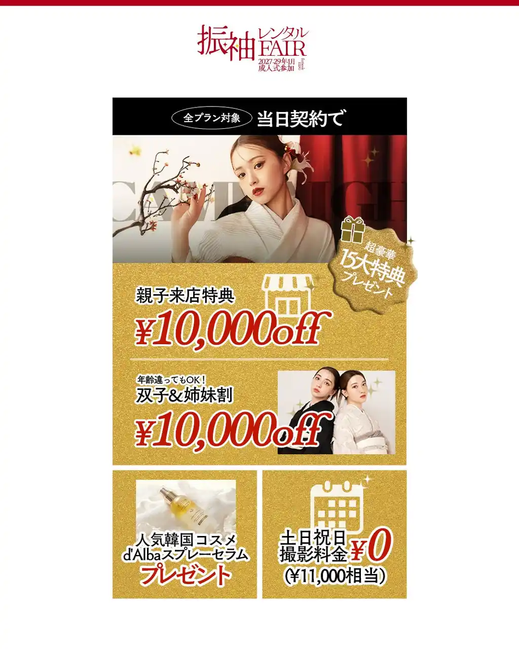 ・高級プレミア振袖50%OFF ・プラン料金最大20,000円OFF に加え、成約時に適用される15大特典を用意しています。 |