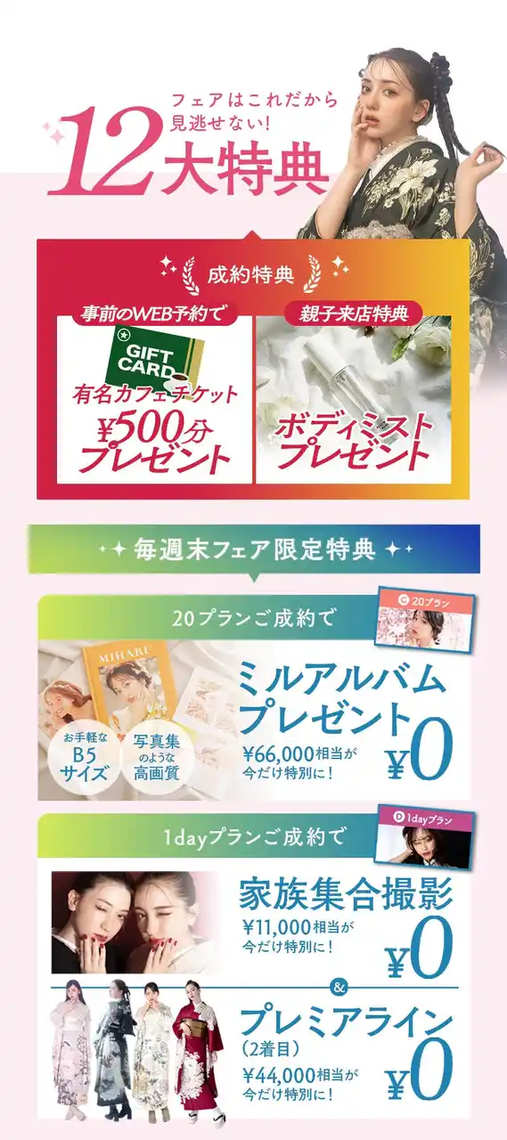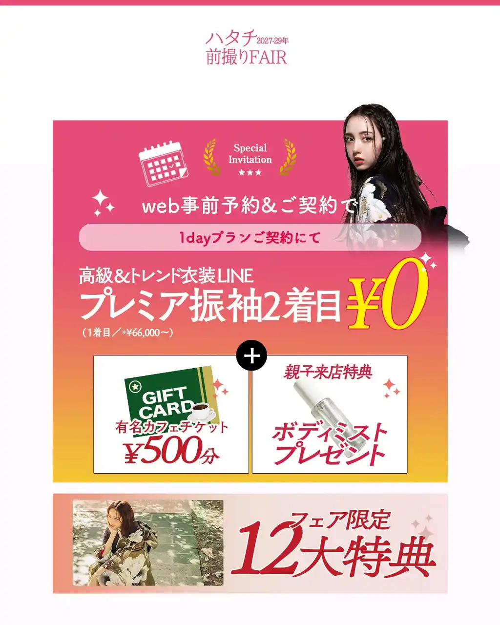 2)親子来店特典でボディミストプレゼント 3)20プランご成約限定!ミルアルバムプレゼント(¥66,000相当) 4)1dayプランご成約限定!プレミアライン2着目が無料(¥44,000相当) 5)1dayプランご成約限定!家族集合撮影無料 |