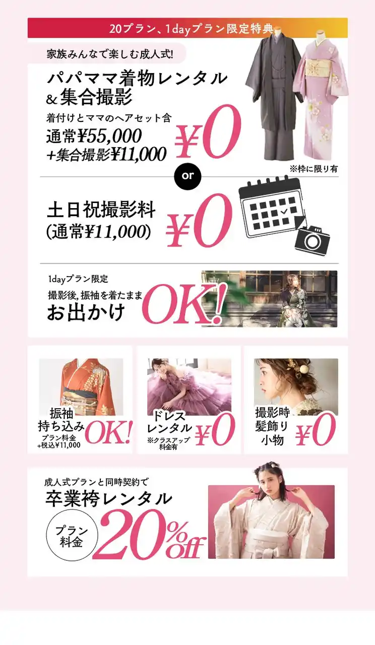 6)パパママ着物レンタル&集合撮影無料 7)土日祝日撮影料金無料 8)振袖を着たままの外出OK! |