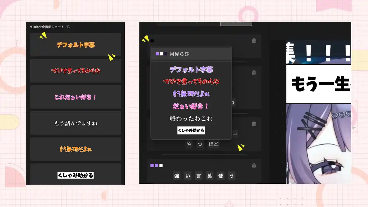 | 文字の多重縁取り、背景色、文字と背景の自動リサイズ等、スタイル上でほとんどの計算を自動的に行うことで、他の動画編集ソフトでは字幕個別に必要な設定を一元化し、人間もAIも入力文字が崩れにくい構造を可能にしています。 | |||||||||||||
