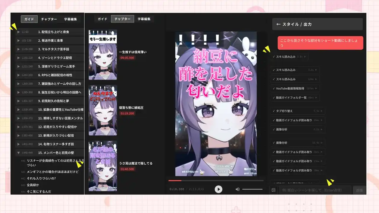 | 具体的なガイドの番号や、おまかせと指定すると、AIエージェントが画面の登場人物の配色確認から始まり、ショート動画の場合は複数の動画案を同時に編集(注1)・提案・エンコード(注2)が可能です。 | |||||||||||||