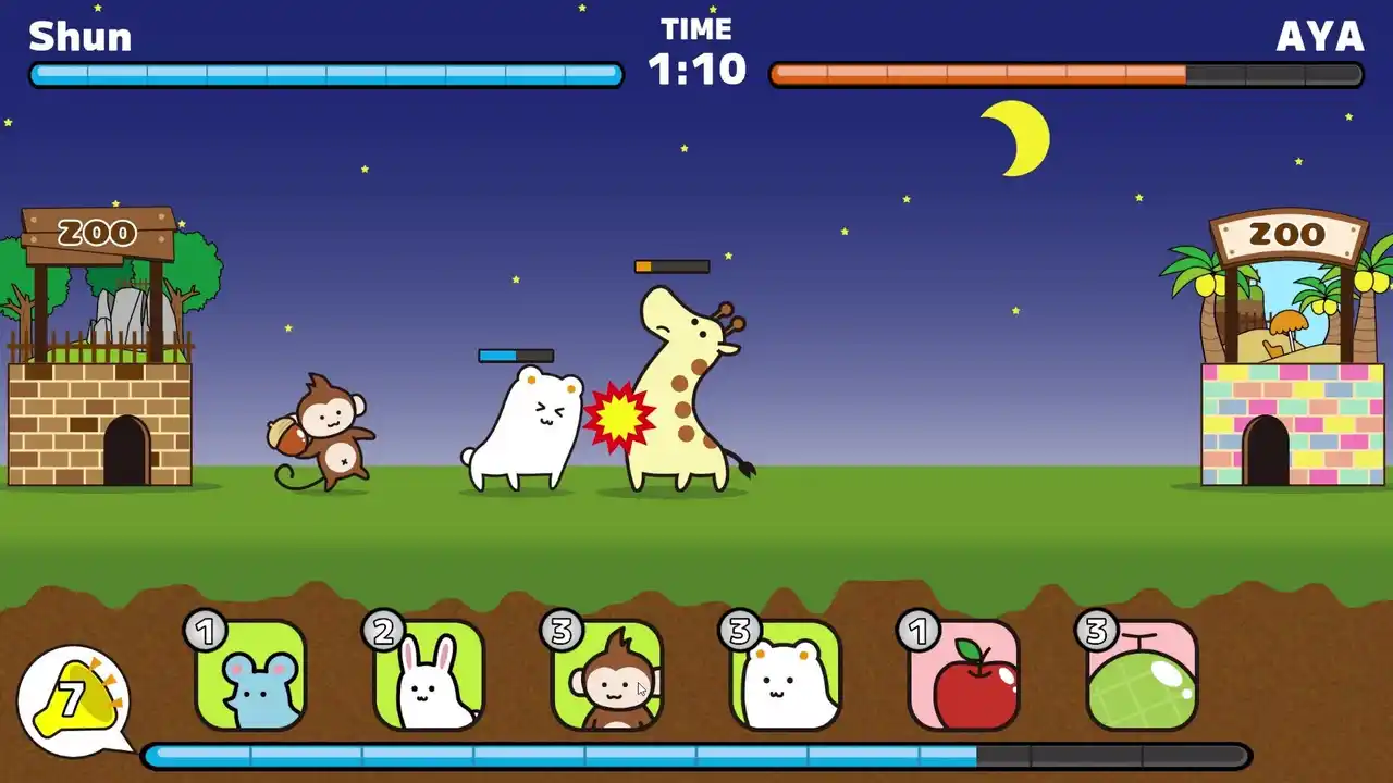 『動物園ウォーズ』は、 かわいい動物たちと果物を使って戦う、 リアルタイム対戦タワーディフェンスゲームです。 |