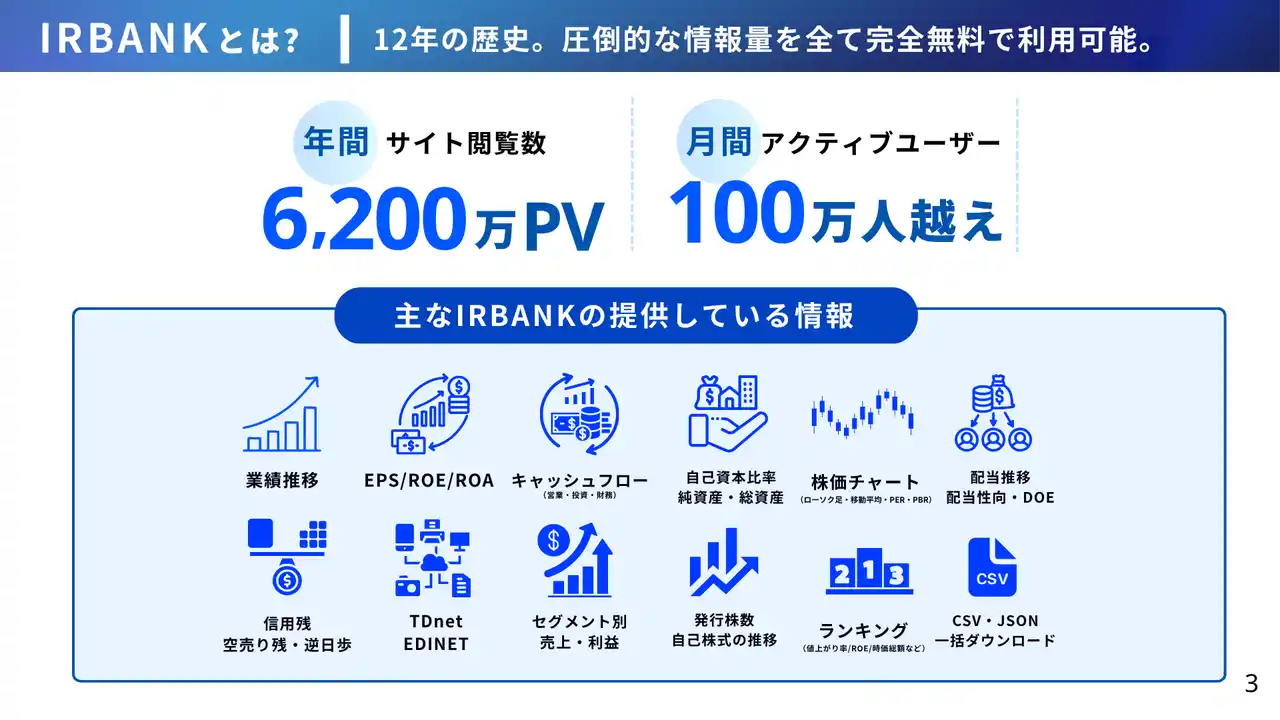 IRBANKは、約4,000社以上の上場企業データを網羅し、過去20年以上にわたる財務・IR情報を蓄積する、月間500万PVの投資情報プラットフォームです。1日あたり数百件に及ぶ最新の開示情報を迅速に提供し、個人投資家から機関投資家、IR担当者まで幅広くご利用いただいております。 |