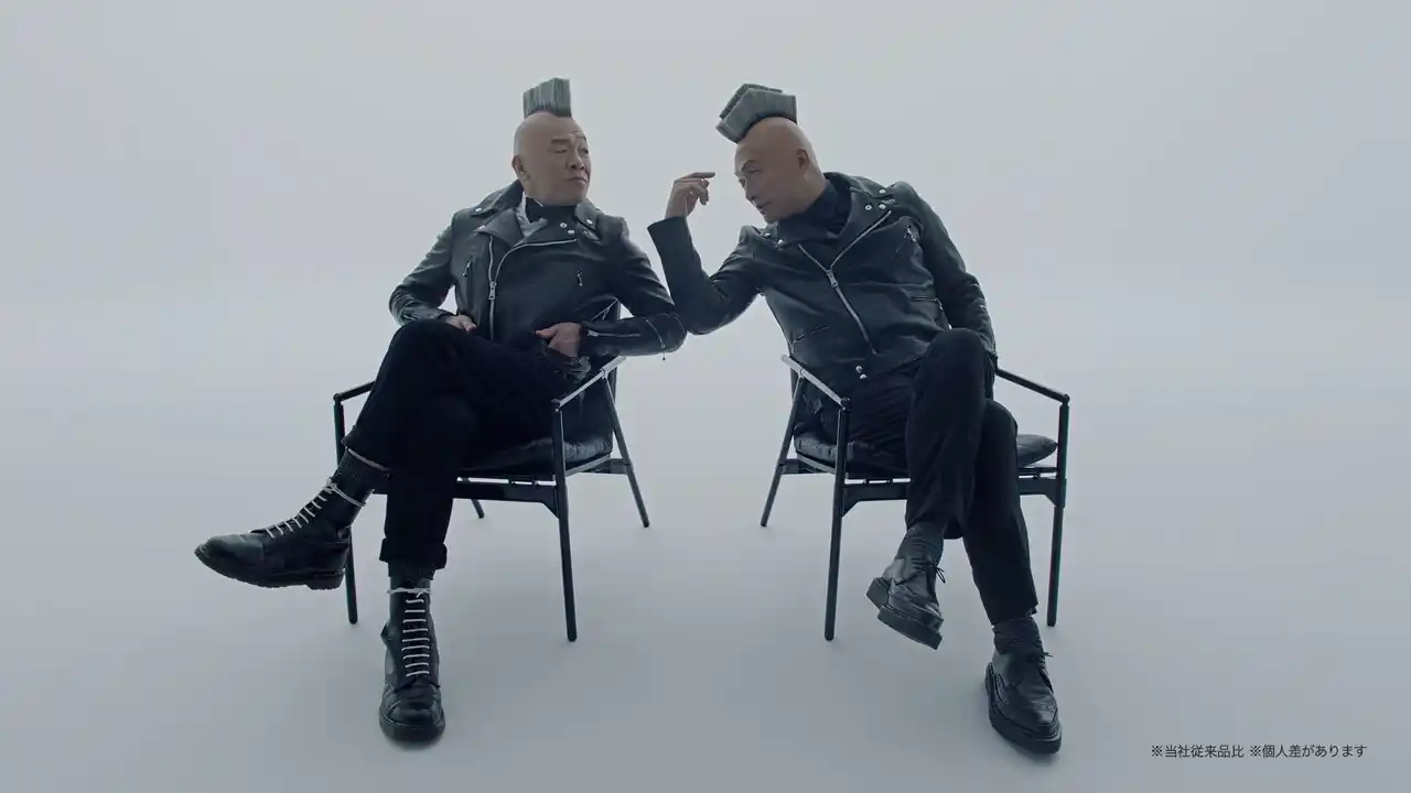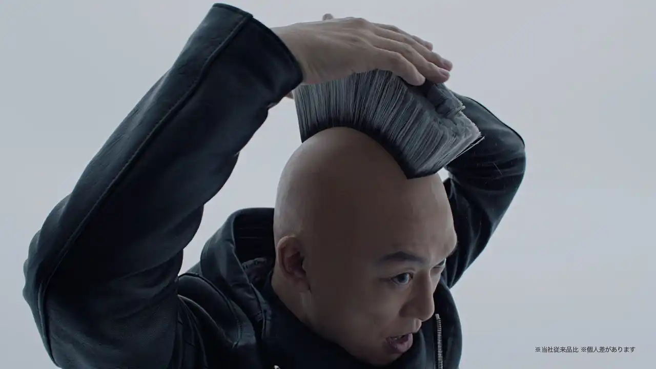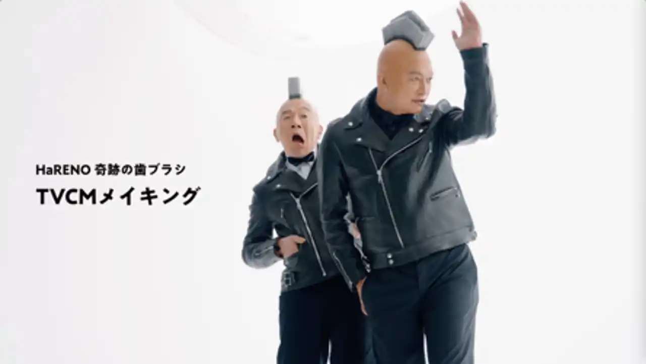 本CMは、歯ブラシの形をヘアスタイルにした謎のパンクロッカーふたりの会話で構成されています。常に常識を疑い、奇跡の歯ブラシに傾倒した香取さんが自分のヘアスタイルを通して奇跡の歯ブラシの素晴らしさを友人のパンクロッカーであるウドさんに伝えるというストーリーです。 |