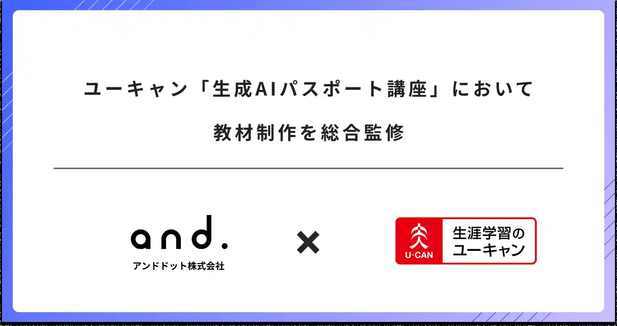AXプロデュース事業(*1)を展開するアンドドット株式会社(本社:東京都渋谷区、代表取締役:茨木 雄太、以下:アンドドット)は株式会社ユーキャン(本社:東京都新宿区、代表取締役:品川 泰一、以下:ユーキャン)が新規開講した「生成AIパスポート講座」における、教材制作の総合監修を務めました。 通信教育のリーディングカンパニーであるユーキャンが求める高い品質基準に応え、受講者が効率よく生成AIパスポート試験に合格するための学習コンテンツ制作を専門性の面から強力にサポートいたしました。 |