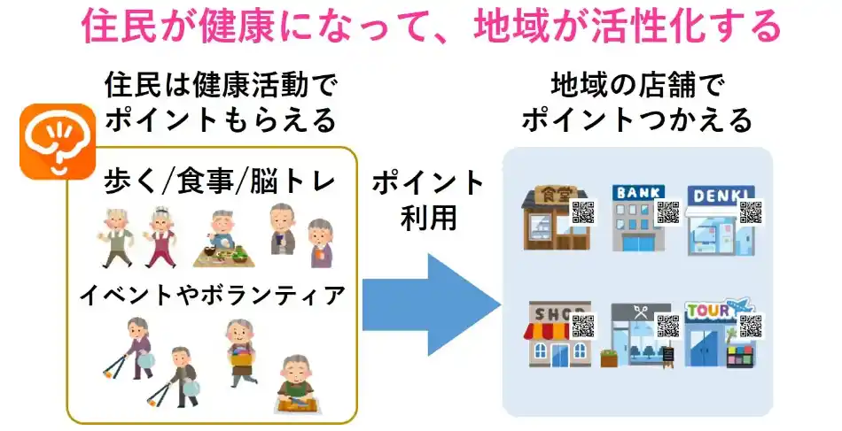 本サービスは、運動、食事、脳トレに加え、ボランティアや地域イベント参加などの社会参加も健康行動として後押しし、日々の取り組みに応じてポイントを付与する仕組みを備えています。獲得したポイントを地域内の店舗等で活用できるため、健康行動の促進と地域経済の活性化を同時に支援できる点が特長です。また、紙や台帳で運用されがちな健康ポイント事業のデジタル化にも対応し、住民の継続利用を支えるとともに、自治体職員の事務負担軽減や業務効率化にも寄与します。 |