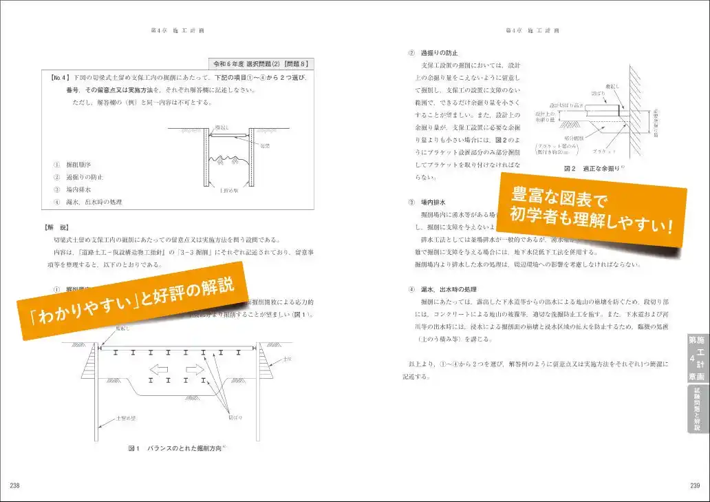 令和6年度の試験から施工経験記述に関して設問の見直しが行われ、これまで1つの管理項目に対する記述を求められたのが、2つの管理項目(安全管理,施工計画)について解答するよう変更されました。本書では、変更内容に対応し、文章の書き方から注意すべきポイント、記述例までを丁寧にサポートしています。 |