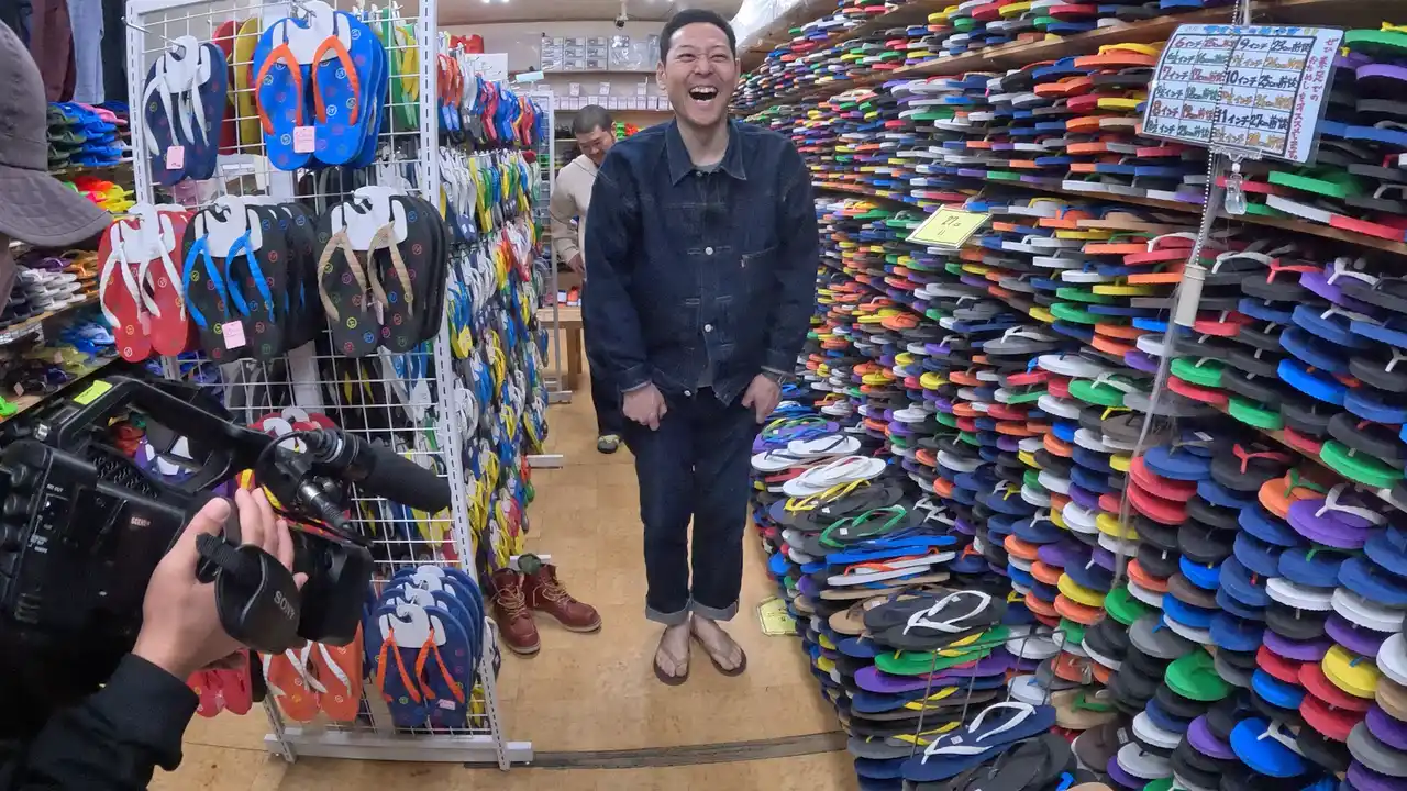 まず訪れたのは、ビーチサンダル専門店「げんべい商店」。こちらは、江戸時代から続く老舗で、もともとは足袋店だったとのこと。 |