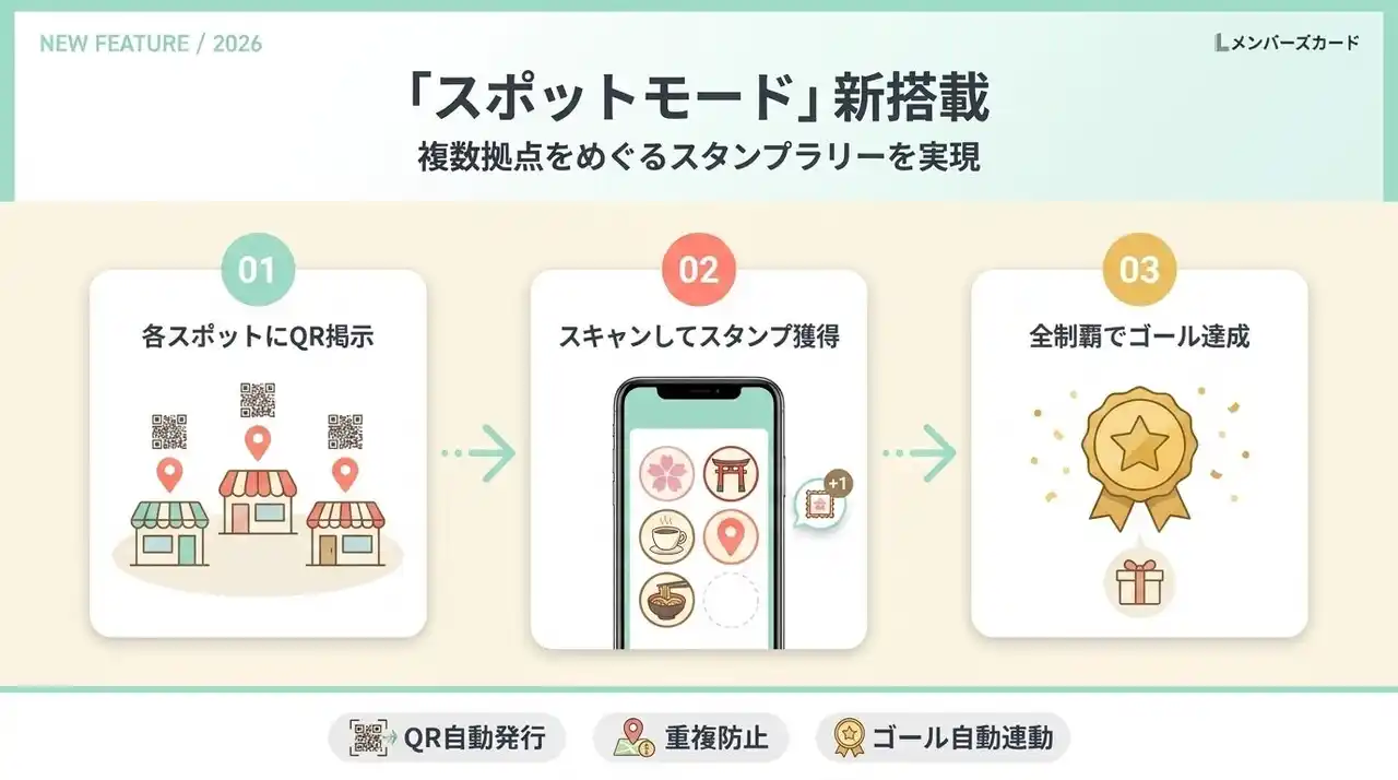 合同会社Oblivion(所在地:東京都千代田区、代表社員:佐藤日出輝)が提供するLINEデジタル会員証システム『Lメンバーズカード』において、2026年4月17日より、スタンプカード機能の新オプション 『スポットモード』 の提供を開始しました。 |