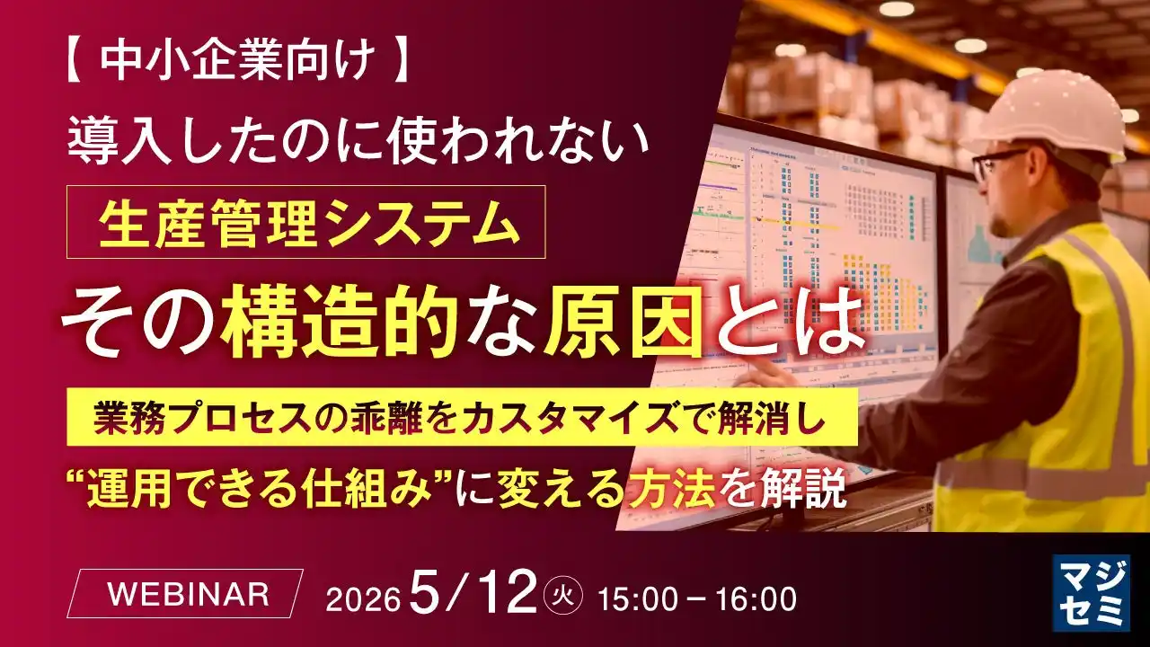 | マジセミ株式会社は「【中小企業向け】導入したのに使われない生産管理システム、その構造的な原因とは」というテーマのウェビナーを開催します。 |