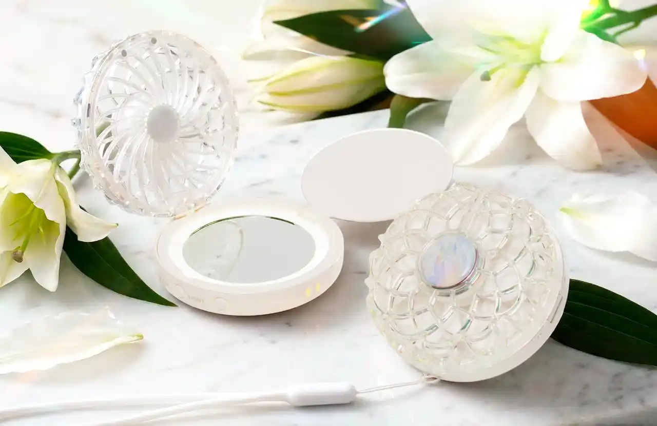 「ミラハナファン」は、オーロラのような艶感と丸みのあるフォルムに加え、リングライトがふわっと輝くことで、まるで“魔法のコンパクト”のような存在感を演出します。 |
