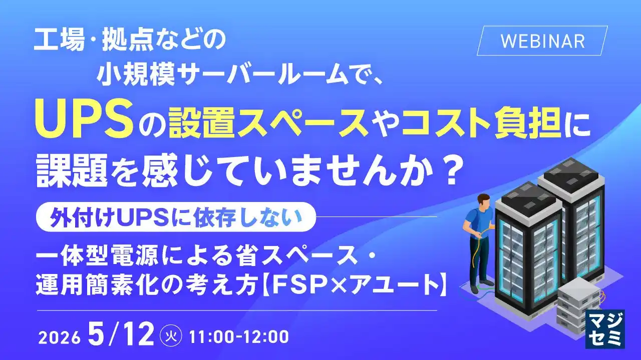 | マジセミ株式会社は「工場・拠点などの小規模サーバールームで、UPSの設置スペースやコスト負担に課題を感じていませんか?」というテーマのウェビナーを開催します。 |