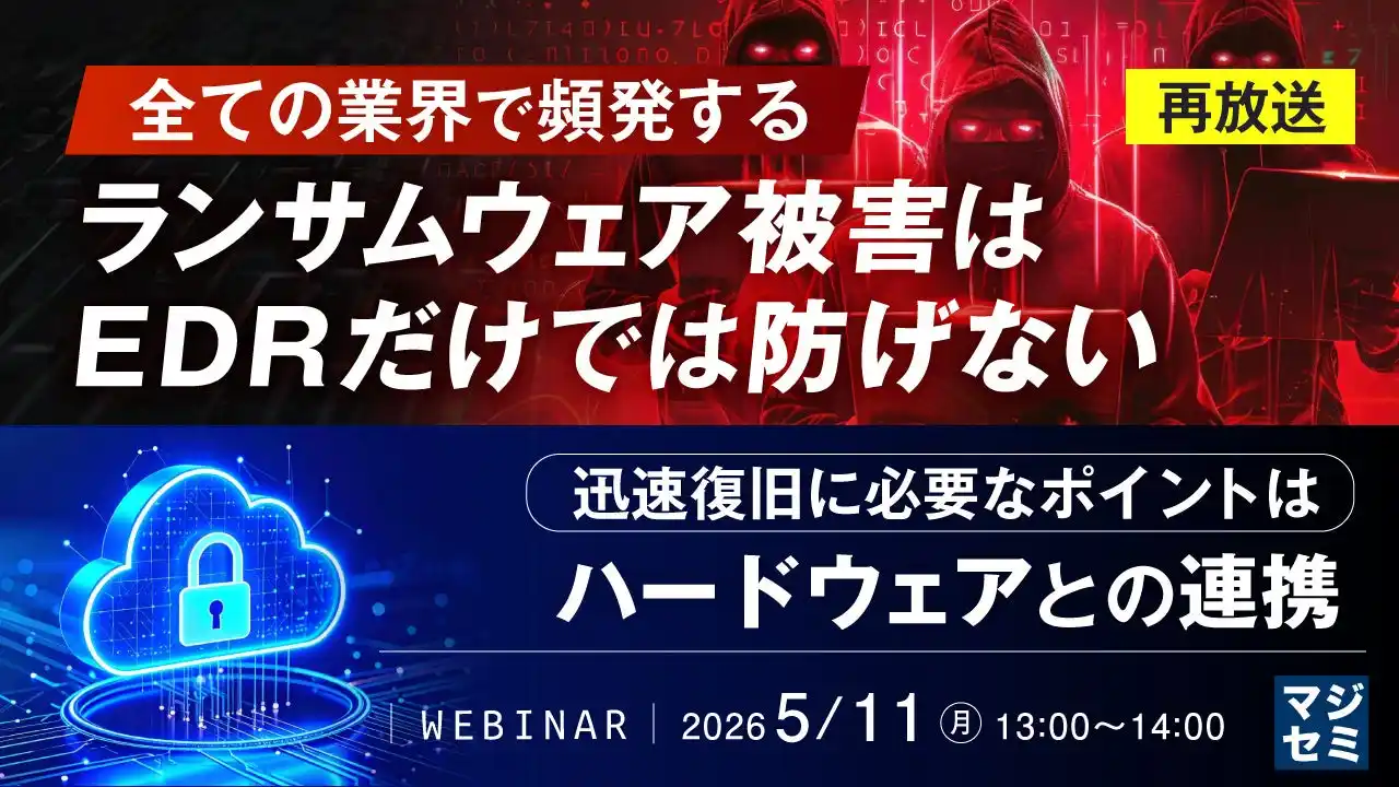 | マジセミ株式会社は「【再放送】全ての業界で頻発するランサムウェア被害はEDRだけでは防げない」というテーマのウェビナーを開催します。 |