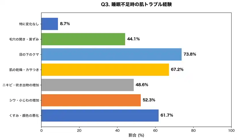 | 睡眠6時間未満の方の91.3%が何らかの肌トラブルを経験しており、特に目の下のクマ(73.8%)、肌の乾燥(67.2%)、くすみ(61.7%)の悪化が顕著でした。シワ・くすみ・ニキビのいずれかを実感した方は80.3%に上り、睡眠不足が複合的な肌悩みを引き起こしていることが分かります。 | ||||||||||||||||||||||||||||