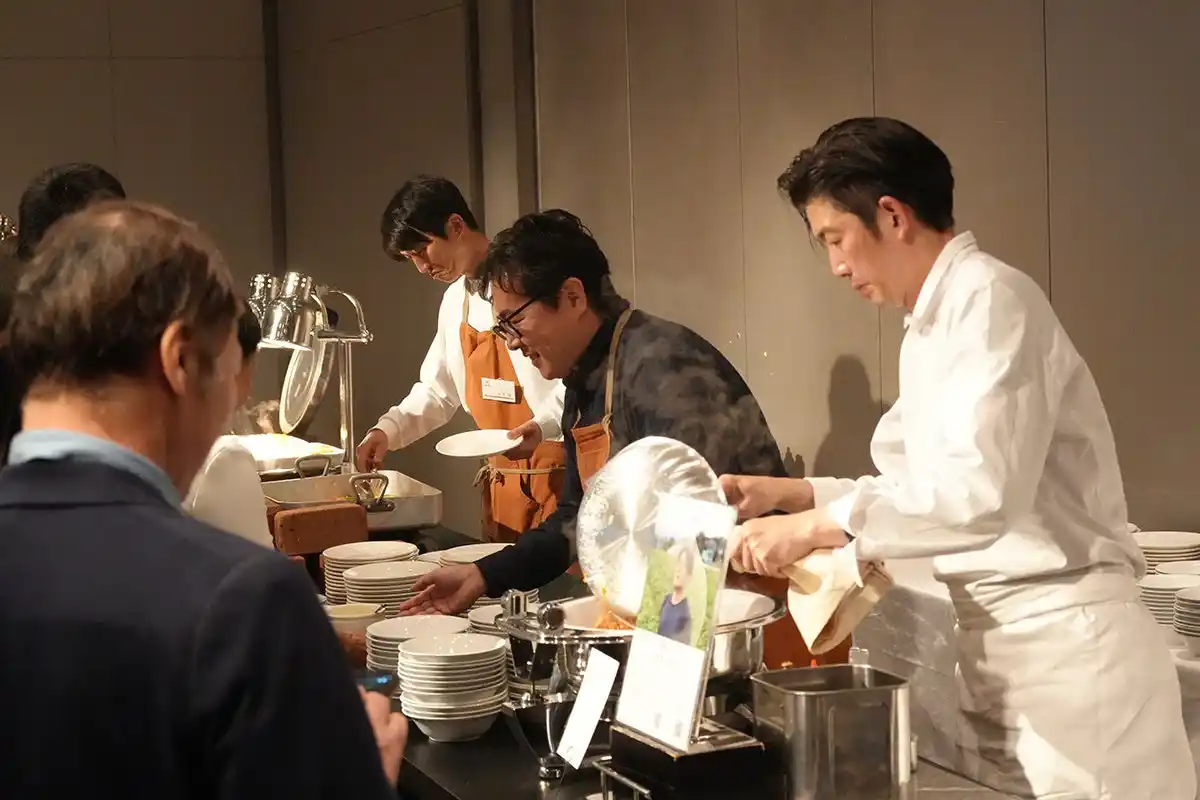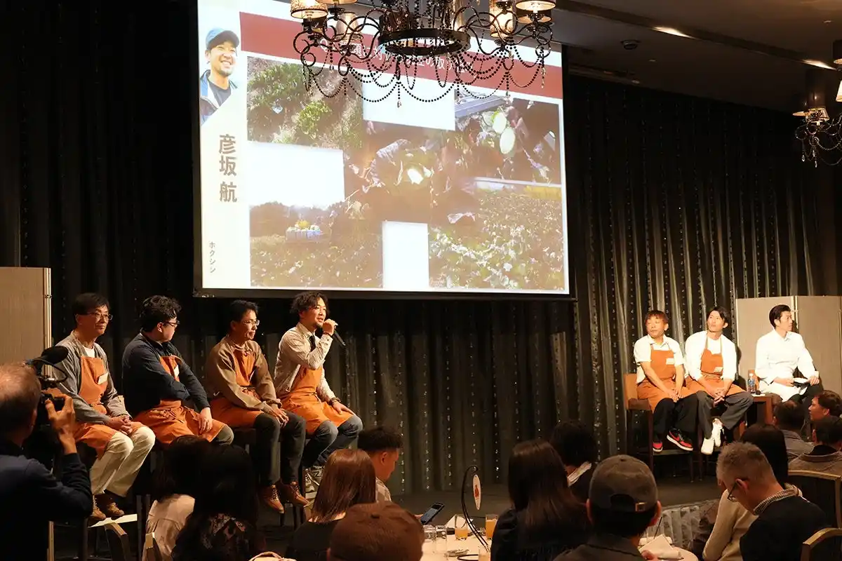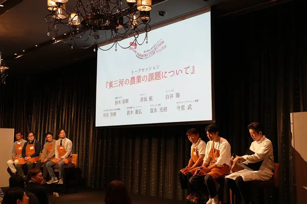 食事開始前には、恒例となったトークセッションを実施。今回は「東三河の農業の課題について」をテーマに、生産者6名と今里総料理長が登壇しました。 気候変動への対応や、未来の農業の担い手不足や一方で労働不足にロボットを搭載するなど、各々が農業を続けていくための取り組みや想いが語られました。 |