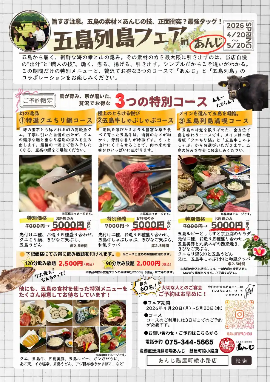 | 京都の旬を届ける「漁港直送海鮮酒場あんじ 麩屋町綾小路店&烏丸六角店(運営:有限会社あんじ)」は、2026年4月20日(月)から5月20日(水)までの1ヶ月間、ゴールデンウィーク期間の目玉企画として、長崎県・五島列島の至宝を味わい尽くす「五島列島フェア」を開催いたします。 | |||||||||||||||||||