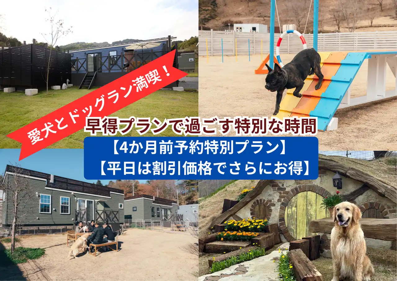 大型ドッグランオープンを記念して、早期宿泊予約キャンペーンとして4か月前にご予約のお客様限定のドッグラン利用券付&愛犬のおやつ付プランの販売を実施します。この機会にぜひ公式ホームページの早得プランからお申込みください。 |