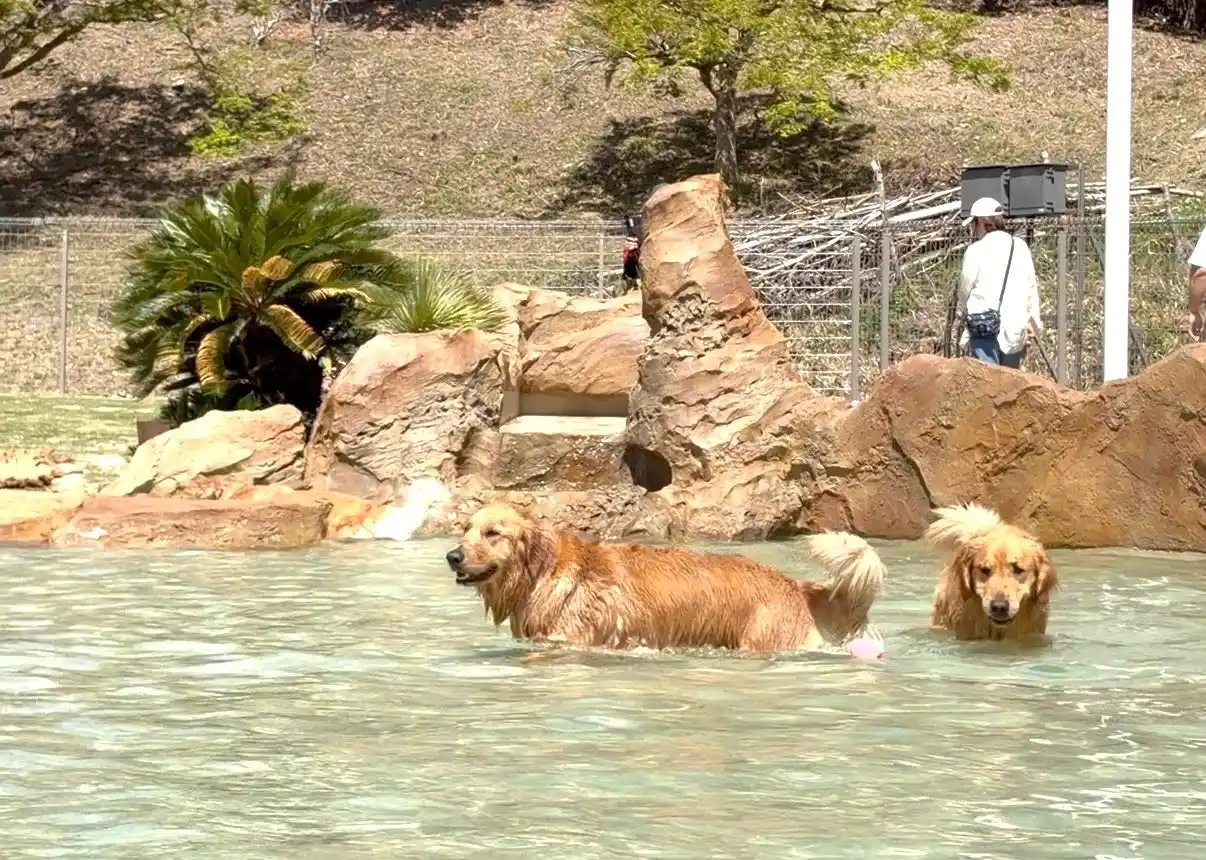 グランドオープンに先がけ4月11日に、新旧Ell’s Park 長瀞アンバサダー犬を迎え入れてプレオープンを実施いたしました。当日は傾斜のあるドッグランを思いきり走り回ってじゃれあうハスキーたちや、水遊びに夢中なゴールデンレトリーバーたちに飼い主様たちの笑顔がいっぱいでした。中でも普段は聞き分けの良い旧アンバサダー犬のハスキーが、まだ帰りたくない様子でプールから出てこなくなっていたのはとても印象的でした。 |