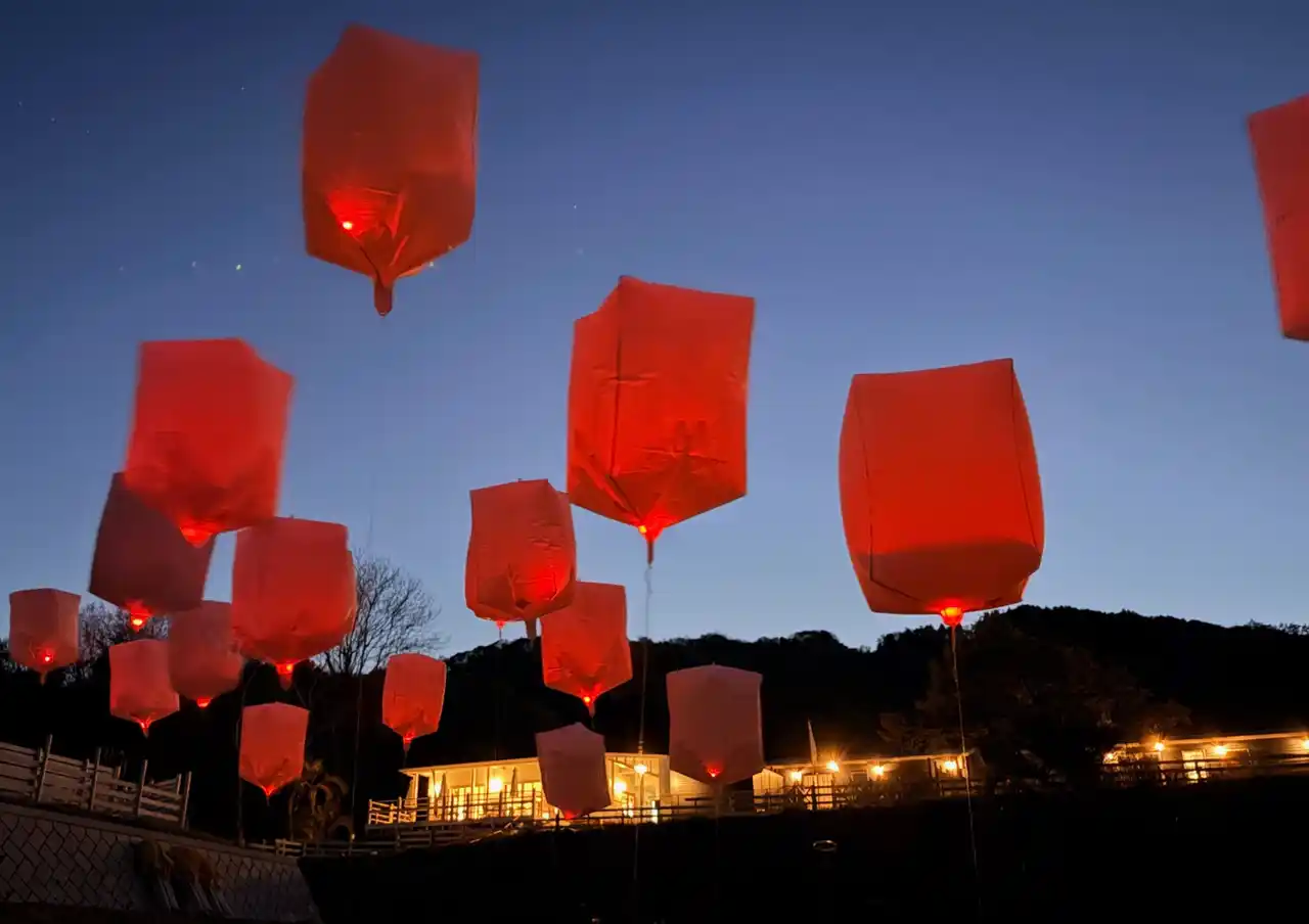 夜にはランタンを飾り幻想的な雰囲気の中お散歩を楽しんでもらいました。※スカイランタンはナイトドッグラン開催時期に不定期で開催予定。 |