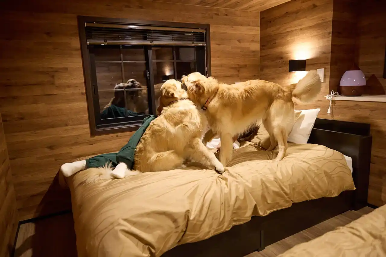 施設には宿泊も可能。愛犬との添い寝が可能なベッドルームやサウナ、プロジェクター、など、ご家族で楽しめる設備がたくさん。 |