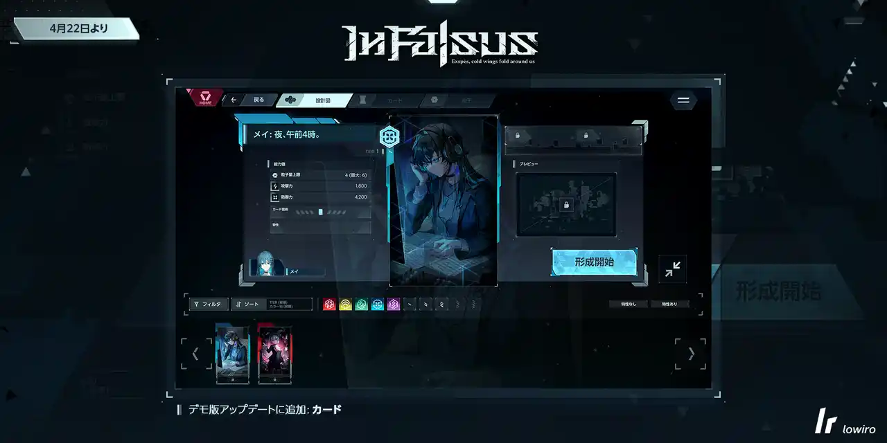 デモ版のアップデートにより、カード形成システムのチュートリアルが新たにプレイ可能となります。カード形成に加えて、粒子を用いた設計図システムも体験可能です。 |
