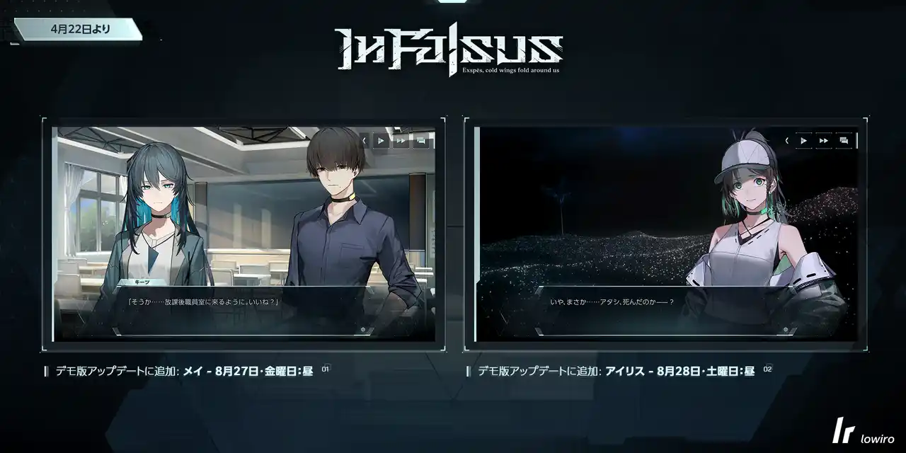 メイ役の春花らん様、アイリス役の藤上あやめ様、ニア役の和泉風花様、のボイス付きシナリオがプレイ可能に。『In Falsus』製品版では、すべてのキャラクターがフルボイスで登場します。 |