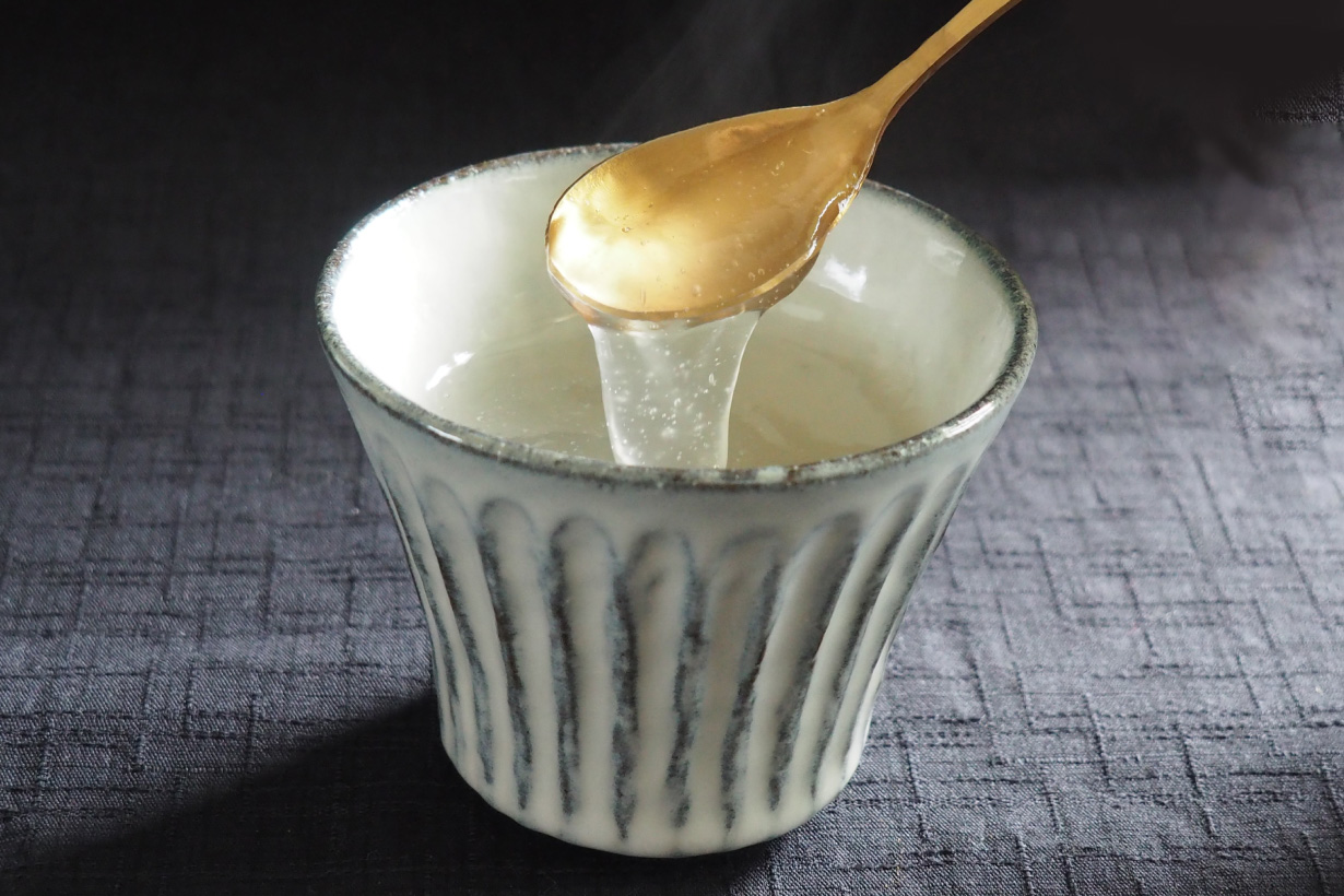 葛湯の粉をお湯で溶くことで透明感のあるやわらかなとろみが生まれます。