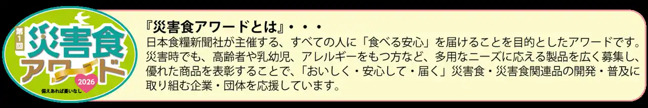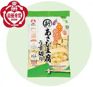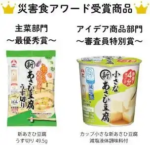 | 旭松食品株式会社(本社:大阪市、本店:長野県飯田市、代表取締役社長:木下博隆)は、高野豆腐「新あさひ豆腐」シリーズの『新あさひ豆腐 うす切り49.5g』および『カップ小さな新あさひ豆腐 減塩液体調味料付』が、日本食糧新聞社主催「第1回 災害食アワード2026」において、主菜部門 最優秀賞、アイデア商品部門 審査員特別賞のダブル受賞をいたしました。 | |||||||||||