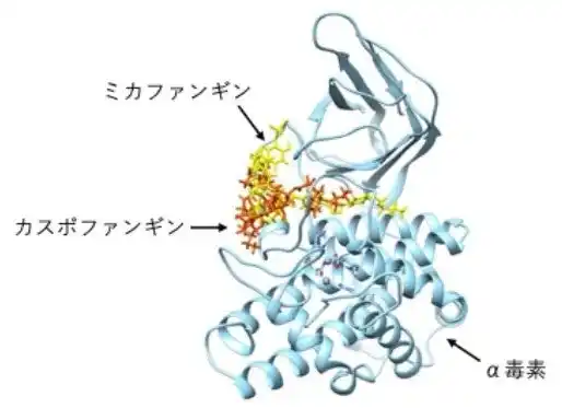 図1:抗真菌薬ミカファンギンおよびカスポファンギンがウエルシュ菌α毒素に結合する様子 |