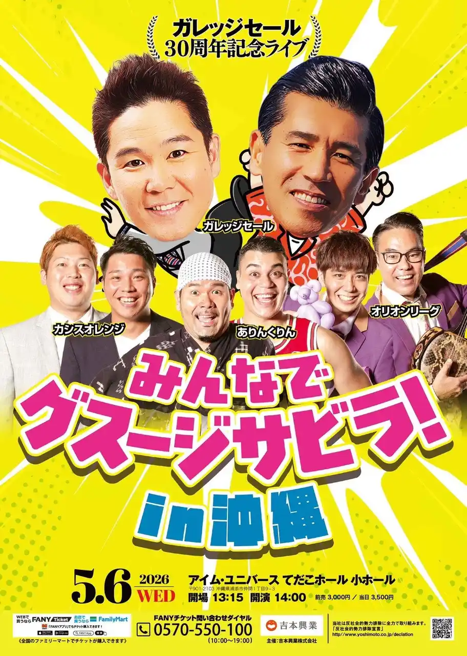 ガレッジセール30周年記念ライブ『みんなでグスージサビラ!in 沖縄』を、2026年5月6日(水)に沖縄 アイム・ユニバース てだこホール 小ホールにて開催することが決定しました。今年3月に東京公演で大盛況に終わったライブを沖縄でも急遽開催いたします。 |