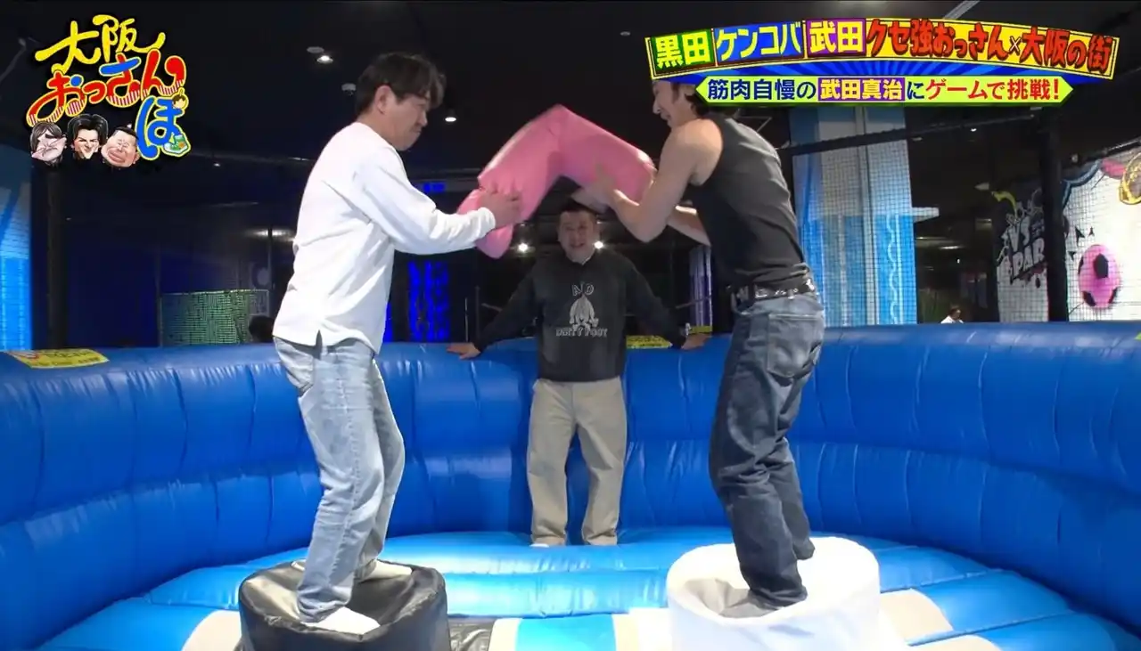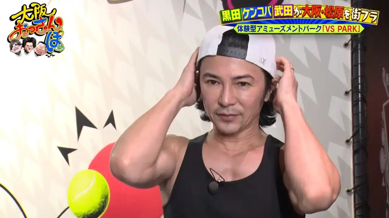腹ごしらえを済ませたおっさんたちは、「VS PARK」へ。ここは、テレビのバラエティで見たことがあるようなアトラクションが体験できるエリア。すると武田は腕立て伏せでパンプアップし、自慢の筋肉を披露! 黒田は「すごいなぁ、筋肉!」とびっくり。 |