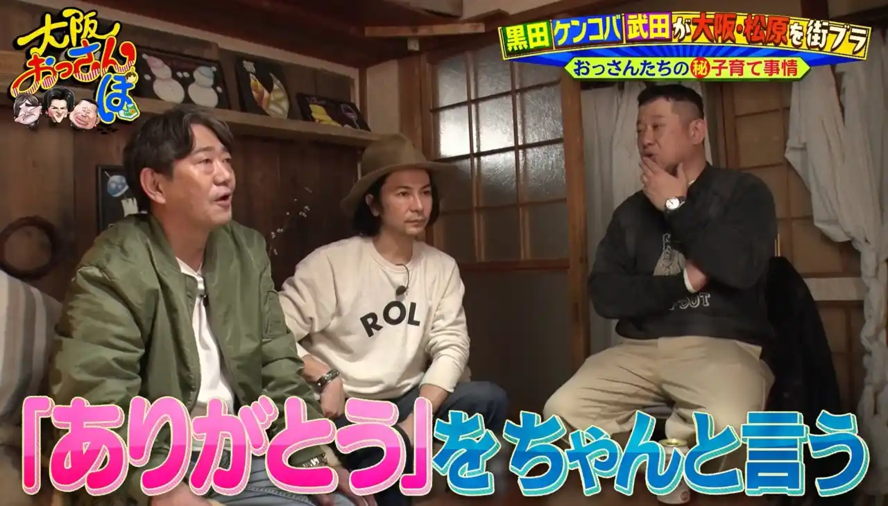 続いて近鉄河内松原駅周辺をぶらり。駅近くで見つけた古民家カフェに立ち寄る。そこで子育て談義に花を咲かせるおっさんたち。娘を愛嬌のある子に育てたいと話す黒田だが、自分が男ばかり4人兄弟の末っ子ということもあり「女の子の気持ちがまったくわからない。どうしたらええんやろ?」と吐露。武田とケンコバにアドバイスを求める。 |