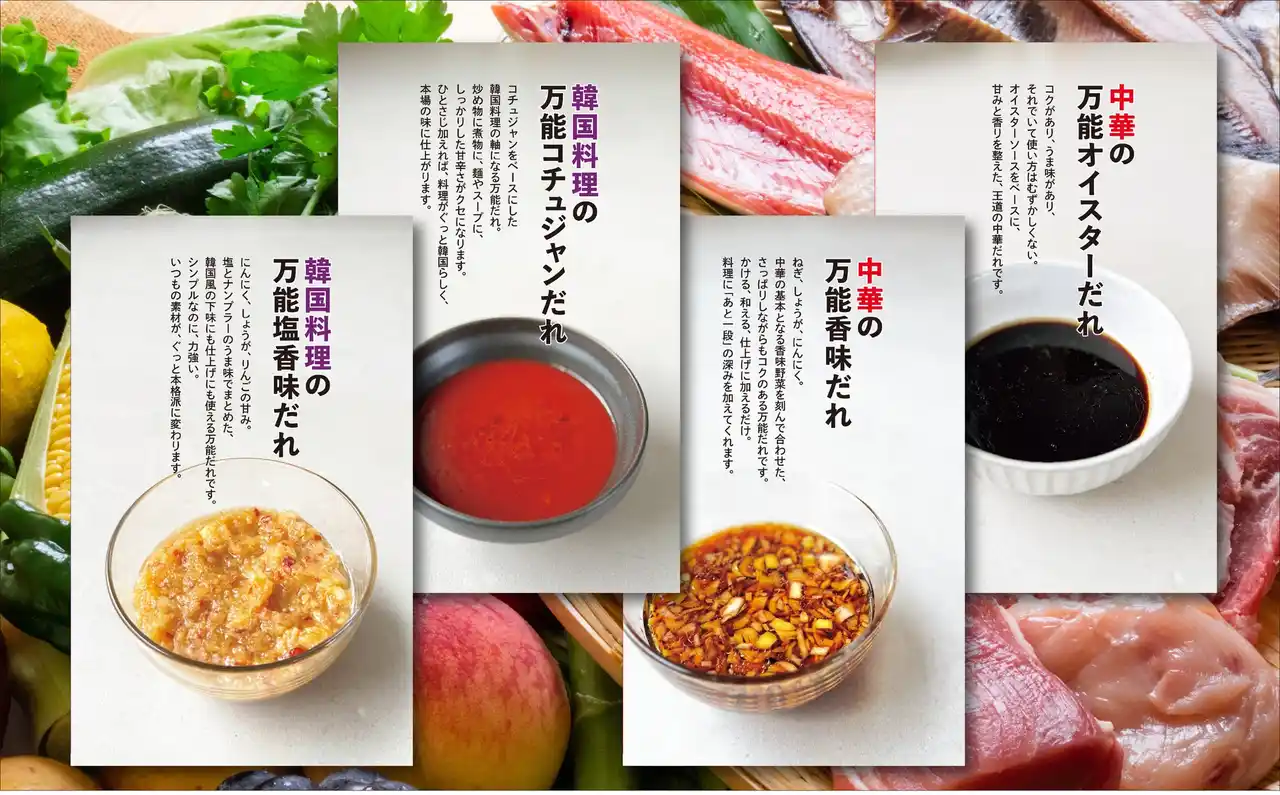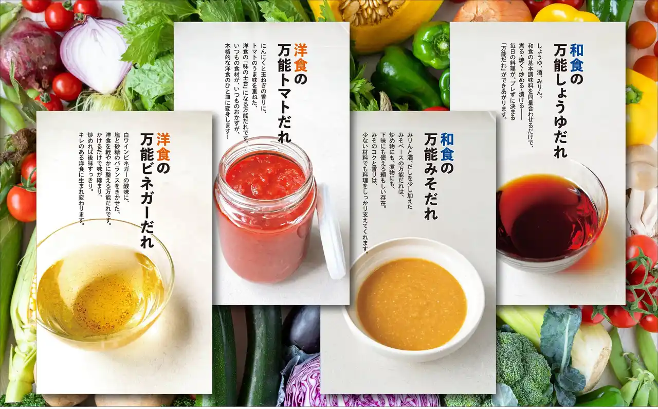 基本の調味料だけで作れる「和食・洋食・中華・韓国」など、汎用性の高い「万能だれ」を各2つずつ提案。煮る・焼く・炒める・あえる・蒸す・かけるなど、その万能だれだけで作れるさまざまな料理のレシピも紹介します。 |