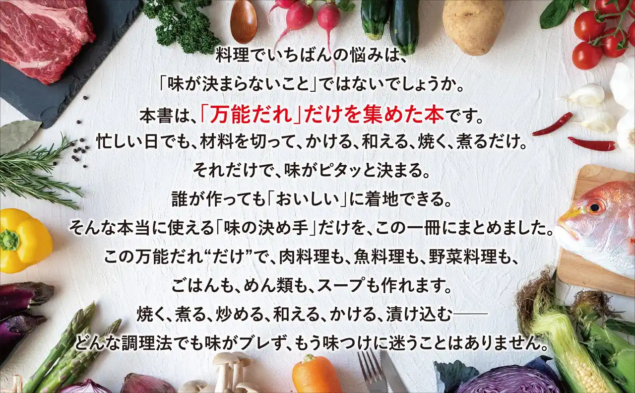 本書は、ひとつ作れば、肉も魚も野菜も、ごはんも麺も、自在に料理が作れる――正真正銘の「万能だれ」の本です。 |