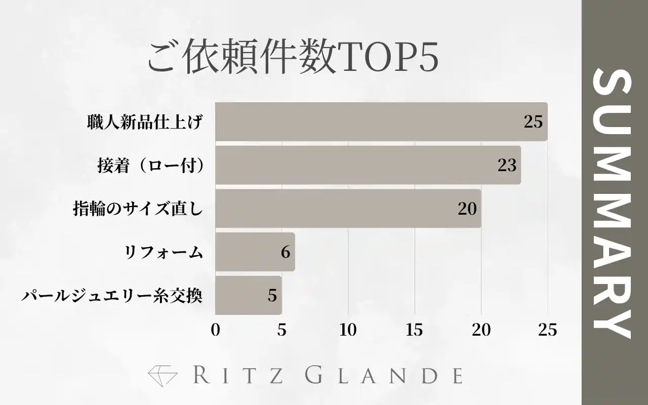北海道札幌市のジュエリー修理・リフォーム専門店のRITZ GLANDEは、2026年3月にご依頼いただいた内容を集計いたしましたので上位5位までをランキング別にご紹介します。 |