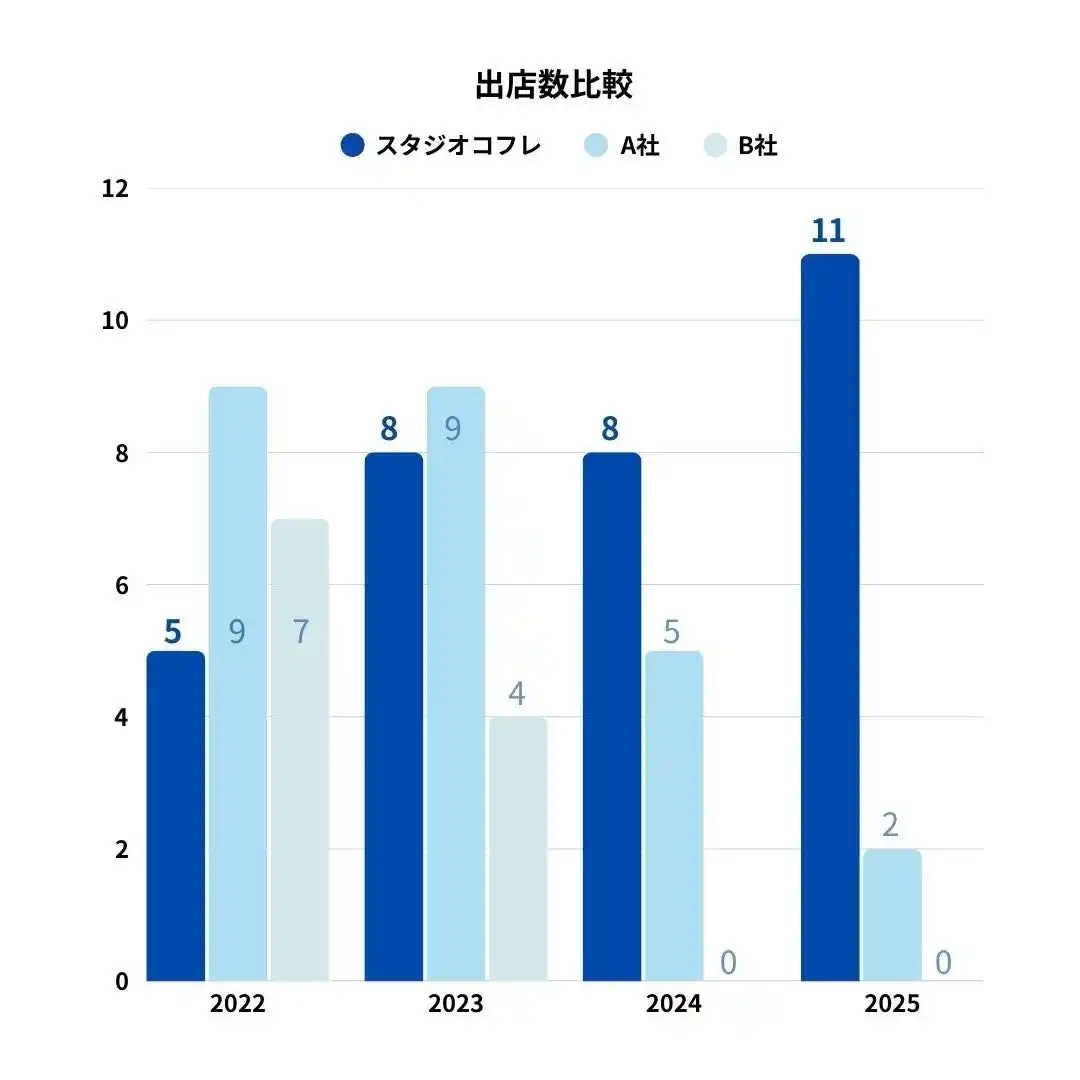 | 撮影・着付け・ヘアメイクなど高い専門性が求められるフォトスタジオ運営は、これまで参入障壁が高い業界でした。スタジオコフレは、これまで培ってきたノウハウをもとにフランチャイズ展開を推進。出店準備から運営、人材育成までを一貫してサポートすることで、未経験からでも高品質なスタジオ運営を可能にしています。品質と収益性を両立できる仕組みが整っているからこそ、全国での出店が加速し、店舗数拡大へとつながっています。 | |||||||||