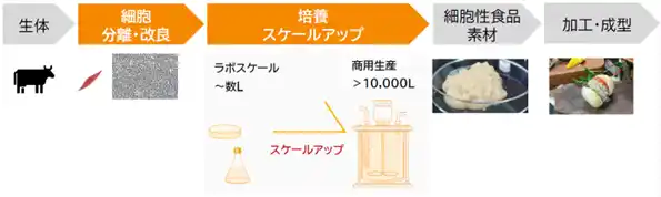 細胞性食品の商品化に至るまでの道のり。今回はラボスケールから200Lの中規模スケールへのスケールアップに成功 |