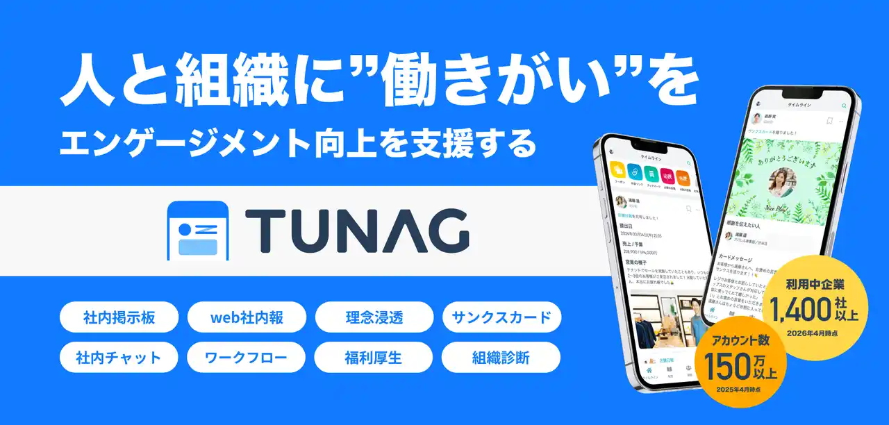 TUNAG(ツナグ)は、組織の生産性向上や離職率の低下を目的とし、社内コミュニケーションと情報共有を促進する統合型プラットフォームです。2026年4月時点で、利用中企業数は1,400社、利用ユーザー数は150万人を突破しています。 |