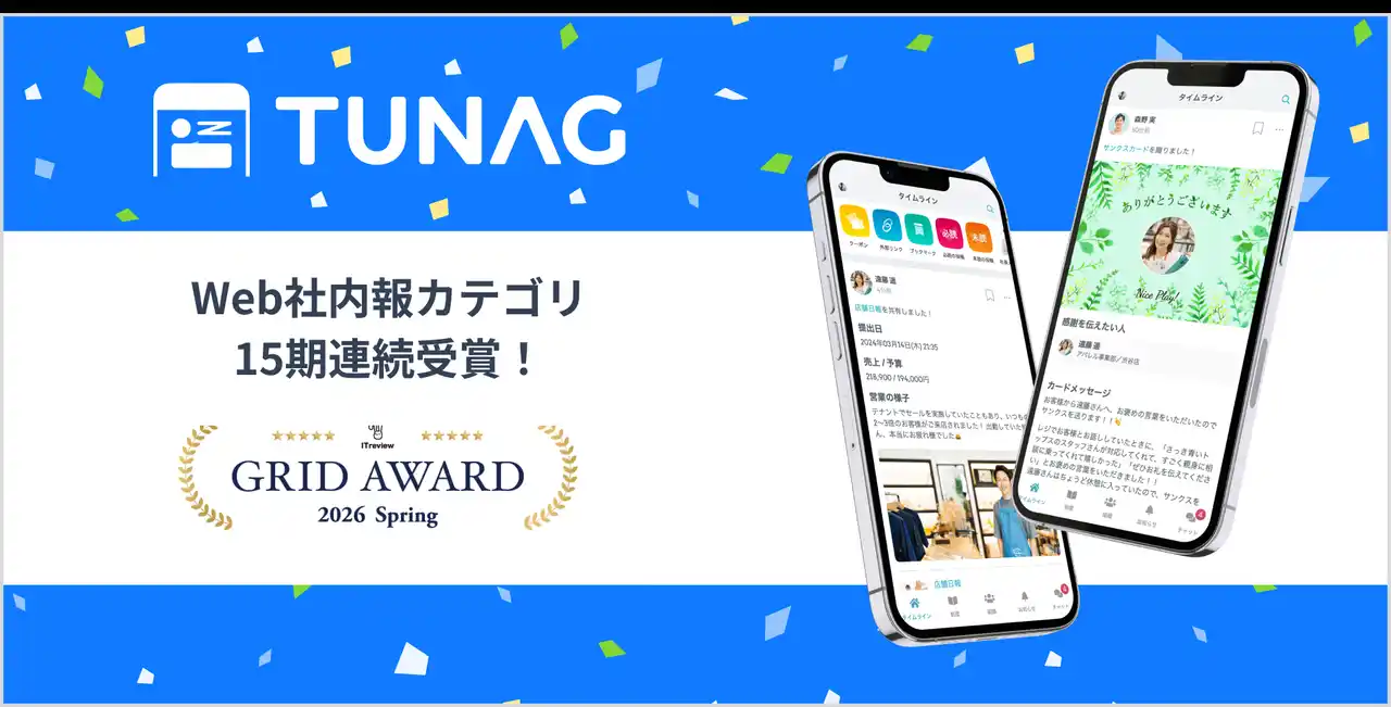 株式会社スタメン(本社:愛知県名古屋市、代表取締役社長:大西 泰平、以下「スタメン」)が提供する従業員体験(EX)プラットフォーム『TUNAG(ツナグ)』は、アイティクラウド株式会社(本社:東京都港区、代表取締役社長:黒野 源太、以下「アイティクラウド」)が主催する「ITreview Grid Award 2026 Spring」において、「Web社内報ツール」の総合部門で「High Performer」を15期連続で受賞しました。 |