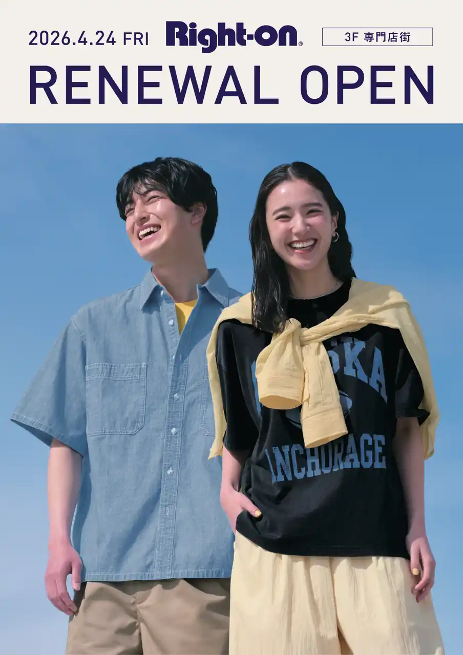 | 株式会社ライトオン(所在地:東京都台東区、代表取締役:大峯伊索)は、Right-on イオンモールKAGOSHIMA BAY店を3Fへ移転し、2026年4月24日(金)にリニューアルオープンいたします。 | |||