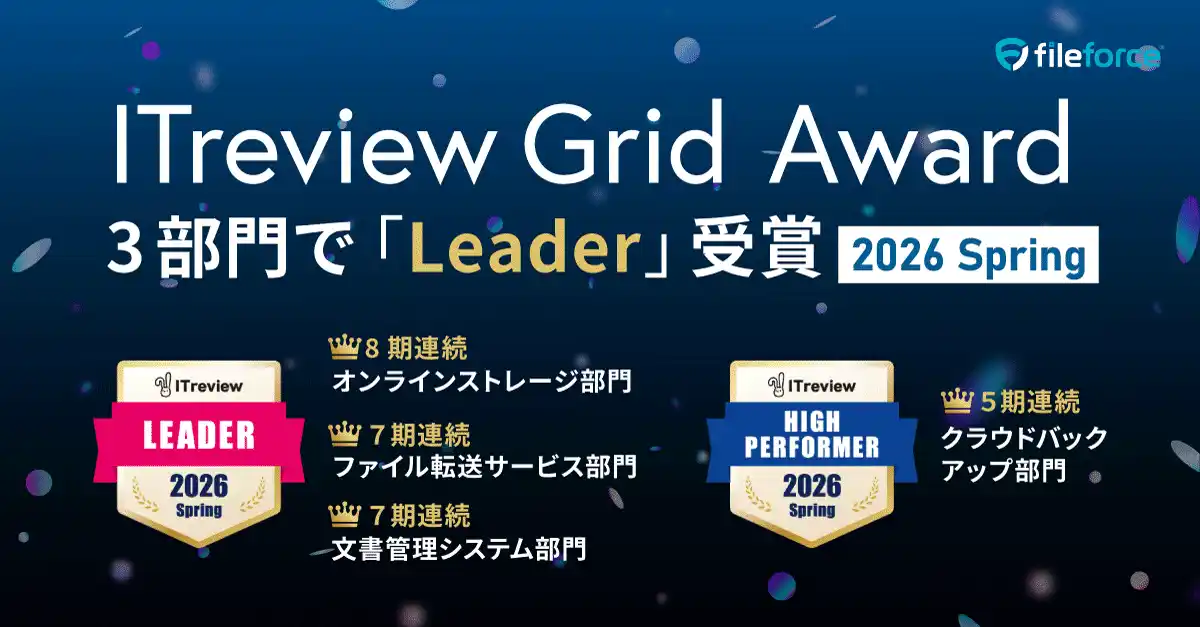 ファイルフォース株式会社(本社:東京千代田区 代表取締役:サルキシャン アラム) は、アイティクラウド株式会社が運営するIT製品のレビュープラットフォーム「ITreview」(https://www.itreview.jp/)に掲載された製品レビュー(口コミ)をもとに、顧客満足度や認知度の高い製品を表彰する「ITreview Grid Award 2026 Spring」のオンラインストレージ、ファイル転送サービス、文書管理システムの3部門で「Leader」を受賞したことをお知らせいたします。 |