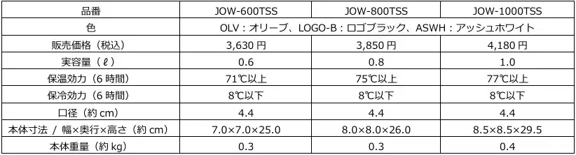 『真空断熱ケータイマグ(JOW-600TSS/800TSS/1000TSS)』 仕様一覧 |